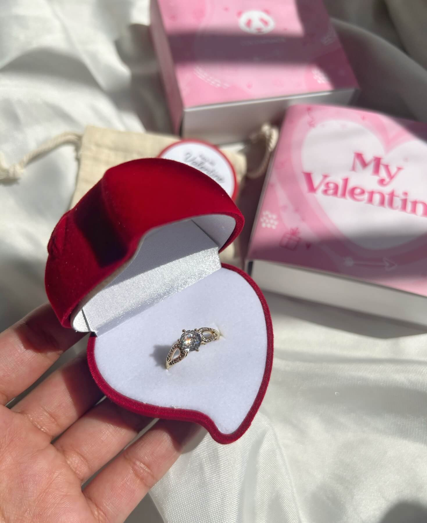 El anillo incluye un empaque listo para regalar. Tarjeta con temática de anillo promesa, cajita corazón rojo, saquito y caja de la marca.